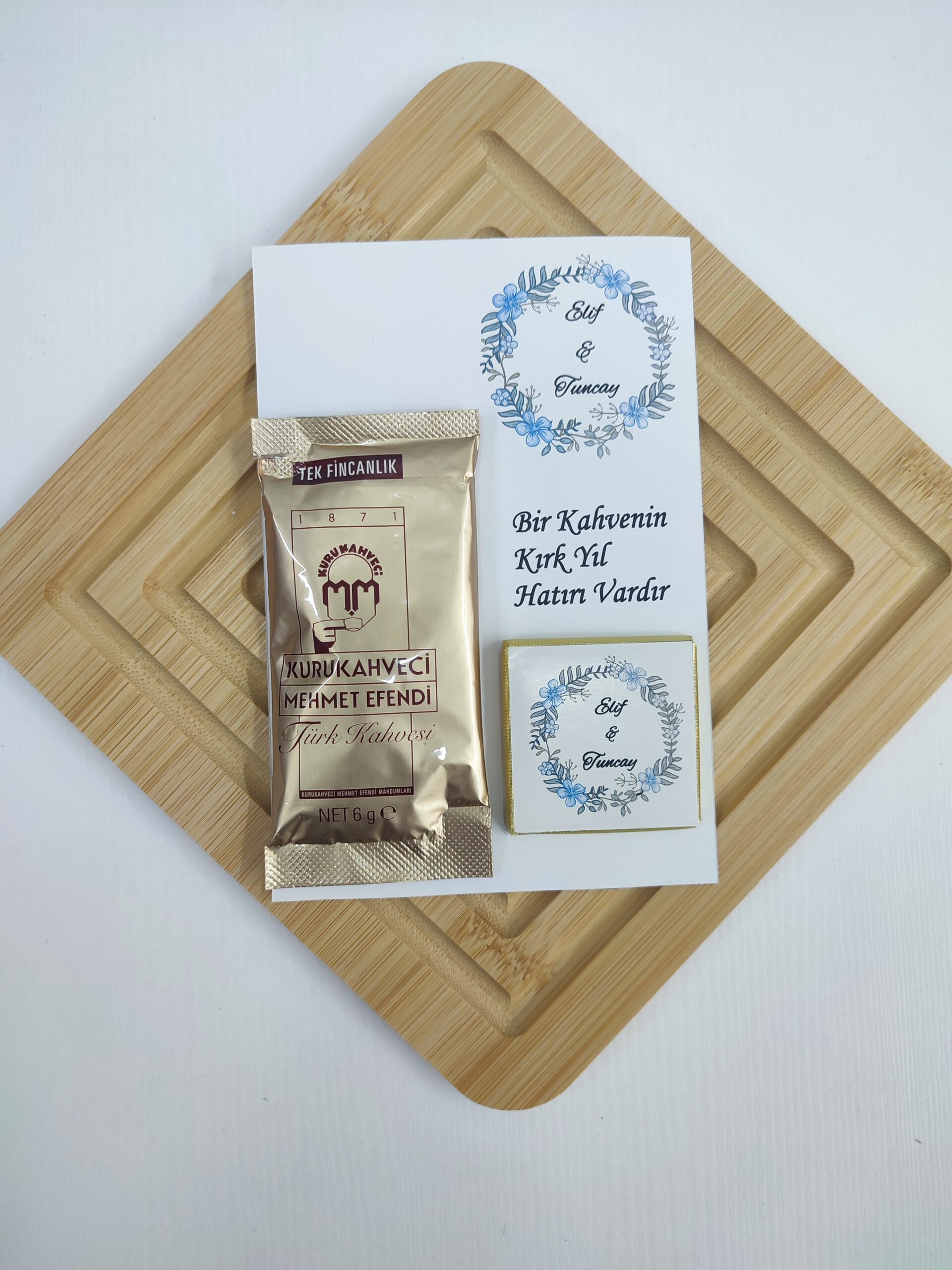 • Kişiye Özel Mukavva Üzerinde Kuru Kahveci Mehmet Efendi 6 gr. Türk Kahvesi ve Üzerinde etiketli Sargılı Madlen Çikolata mevcuttur